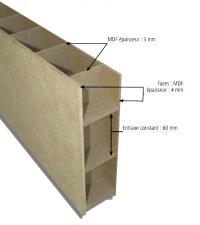 Finsa GreenPanel® a une âme et des faces en MDF mince. L'intérieur de ce panneau est constitué d’une structure en forme de grille, renforçant ainsi la résistance et la stabilité du panneau, notamment pour les applications où une bonne résistance au poids est requise.